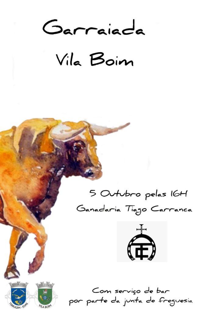 Neste sábado, 5 de Outubro, pelas 16 horas, realiza-se uma garraiada em Vila Boim, com gado da Ganadaria Tiago Carranca, onde haverá também serviço de bar, que estará a cargo da junta de freguesia.