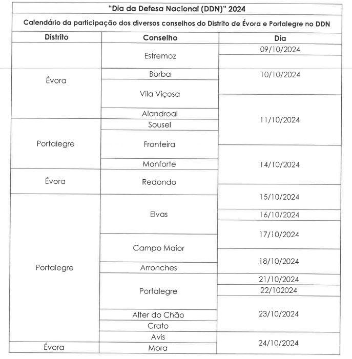 Para a edição deste ano, o CDDN de Estremoz convocou para comparência ao Dia da Defesa Nacional 1106 jovens, de ambos os géneros, provenientes de 16 concelhos dos distritos de Portalegre e Évora, distribuídos por 12 dias úteis.