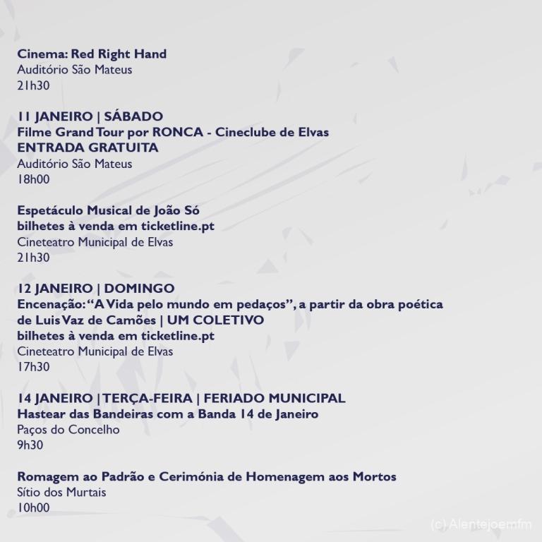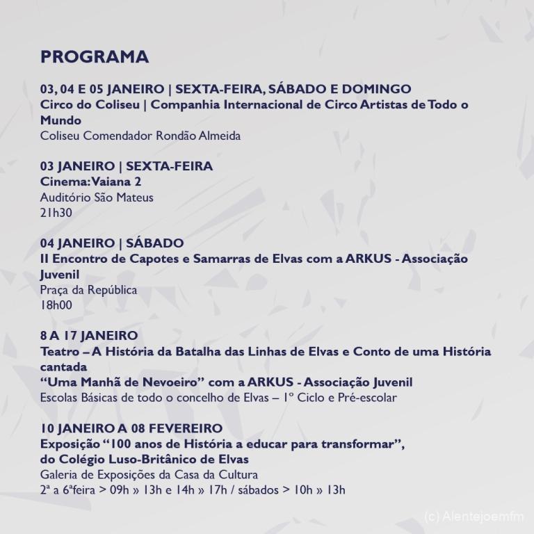 No dia 10, o Colégio Luso-Britânico de Elvas apresenta na Casa da Cultura a exposição “100 anos de História a educar para transformar” e, no dia 11, há espetáculo musical com João Só, no Cine-Teatro Municipal, às 21h30. No dia 12, a UM COLETIVO apresenta, no mesmo espaço, a encenação “A vida pelo mundo em pedaços”, às 17h30.