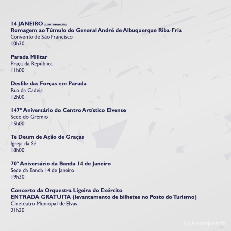 A Câmara Municipal de Elvas acaba de divulgar o programa de comemorações dos 366 anos da Batalha das Linhas de Elvas, celebrada a 14 de janeiro, com as tradicionais cerimónias militares e religiosas.