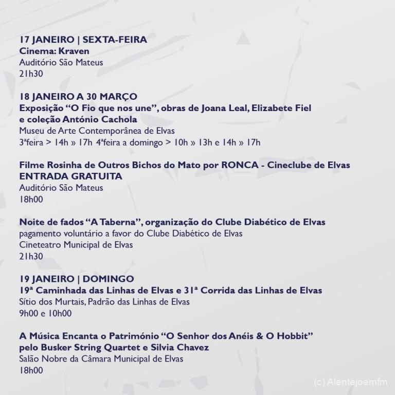 No Museu de Arte Contemporânea de Elvas, no dia 18, é inaugurada a exposição “O Fio que nos Une”, com obras de Joana Leal, Elizabete Fiel e da coleção António Cachola. Destaque ainda para a realização da 19ª Caminhada e da 31ª Corridas das Linhas de Elvas, no dia 19; para a apresentação do livro “A Maternidade, um Parto com Amor”, de Rosa Maria Abrunheiro, e concerto dos Tranquiliza, no dia 24; e para a comédia “Cama para 4”, com Carlos Cunha, no dia 25.