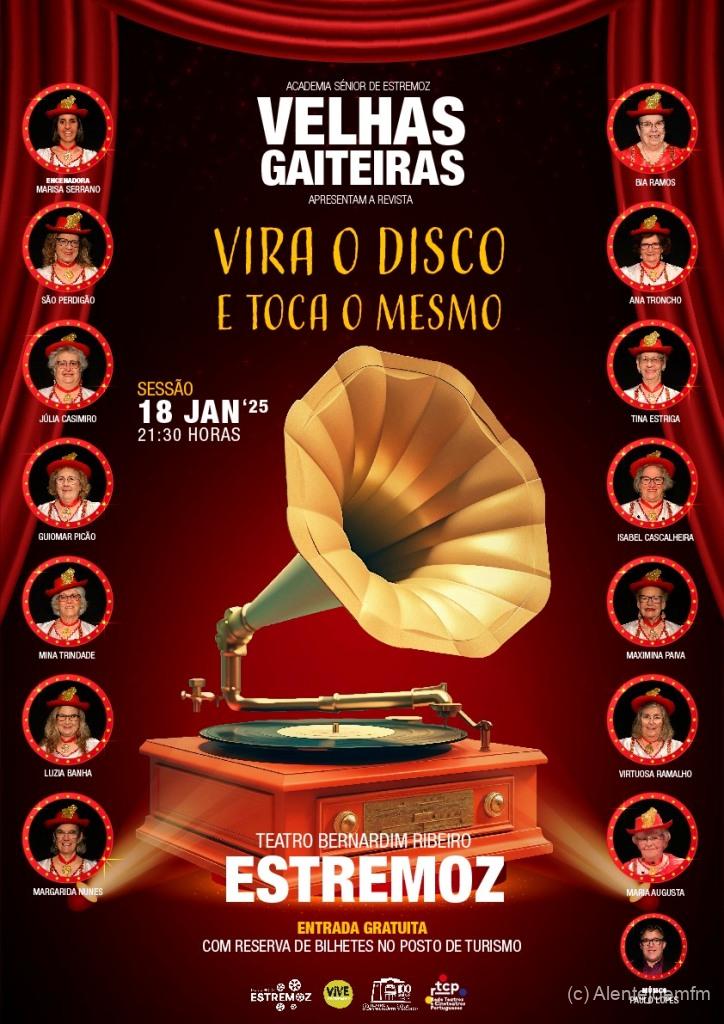 As “Velhas Gaiteiras”, da Academia Sénior de Estremoz, sobem ao palco para o seu último espetáculo relativo à tournée da Revista à Portuguesa “Vira o Disco e Toca Mesmo”, no dia 18 de janeiro (sábado), pelas 21:30 horas, no Teatro Bernardim Ribeiro, em Estremoz.