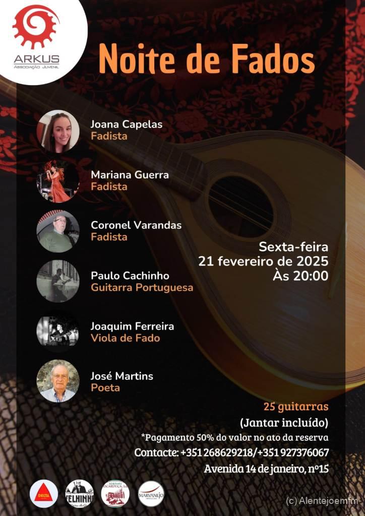A Arkus, Associação Juvenil, vai realizar uma noite de fados, no dia 21 de fevereiro, sexta-feira, pelas 20h, na sua respetiva sede, localizada na Rua 14 de Janeiro, nº 15, em Elvas.