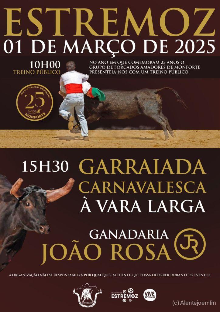 Ainda neste dia, a partir das 15h30, o tauródromo estremocense recebe a Garraiada Carnavalesca à Vara Larga, onde marcarão presença bravas reses da Ganadaria João Rosa.