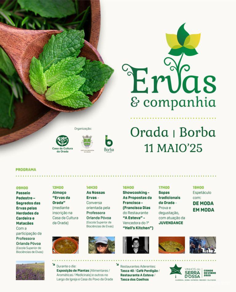 A iniciativa “Ervas & Companhia” está de regresso à freguesia de Orada, no concelho de Borba, este domingo, 11 de maio, num certame que dá destaque às ervas e plantas silvestres comestíveis, aromáticas e medicinais.