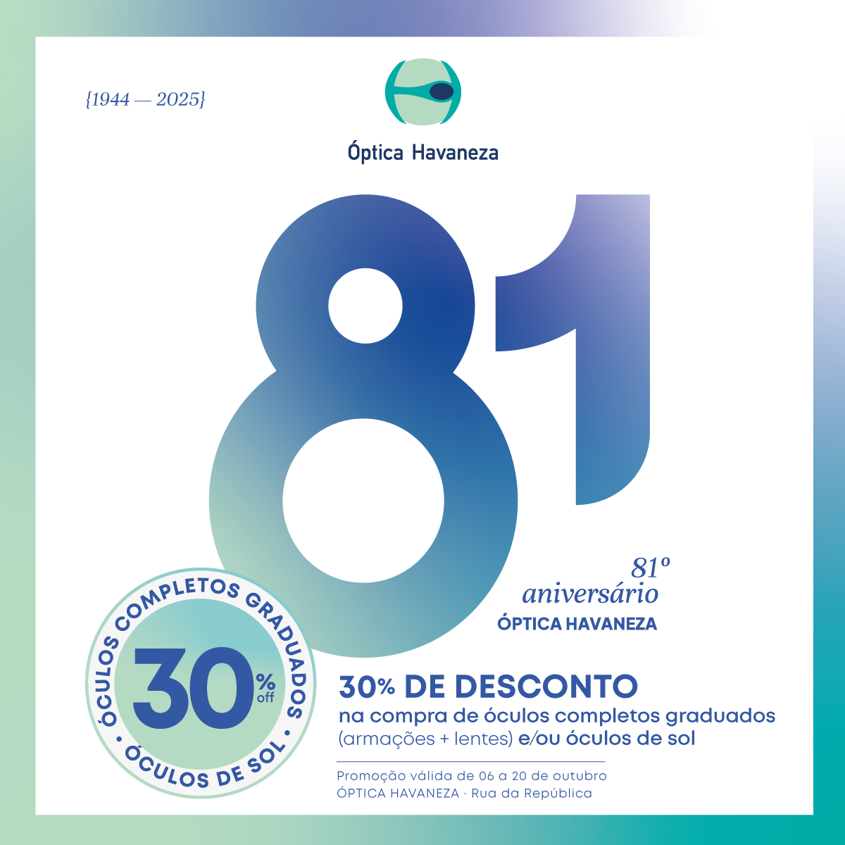 usufruir de ofertas na compra de Armações + Lentes e Óculos de Sol selecionados de valor igual ou superior a 60€. Esta é uma oportunidade única para aliar a celebração dos 81 anos ao cuidado da sua saúde e moda visual. A oferta é limitada ao stock existente e não acumulável com outras campanhas, protocolos ou condições comerciais especiais.