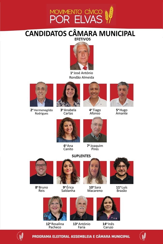 Os candidatos efetivos à Câmara Municipal são José António Rondão Almeida, Hermenegildo Rodrigues, Anabela Cartas, Tiago Afonso, Hugo Amante, Ana Canito e Joaquim Pires.