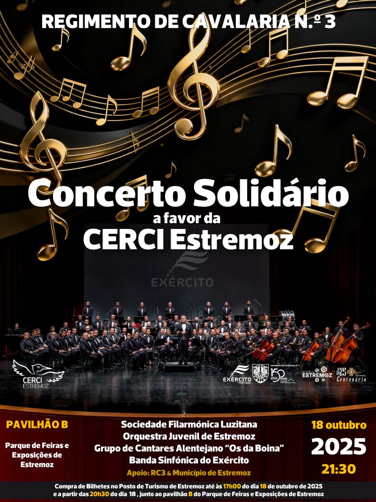 O Regimento de Cavalaria nº 3 promove um Concerto Solidário, no próximo dia 18 de outubro, pelas 21h30, no Pavilhão B do Parque de Feiras e Exposições de Estremoz.