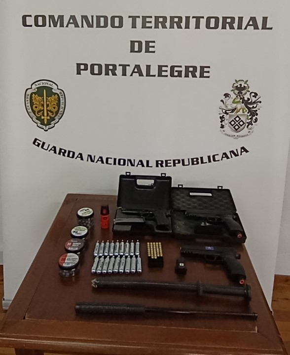 No decorrer da ação, foi realizada uma busca domiciliária que resultou na detenção do suspeito e na apreensão do seguinte material: uma pistola de alarme; duas pistolas de ar comprimido; um bastão extensível de 55 cm; um bastão de borracha de 55 cm; 37 munições de salva; 175 esferas de borracha; diversas botijas de CO2; um acessório de laser para utilização em arma de fogo e uma embalagem de gás pimenta.