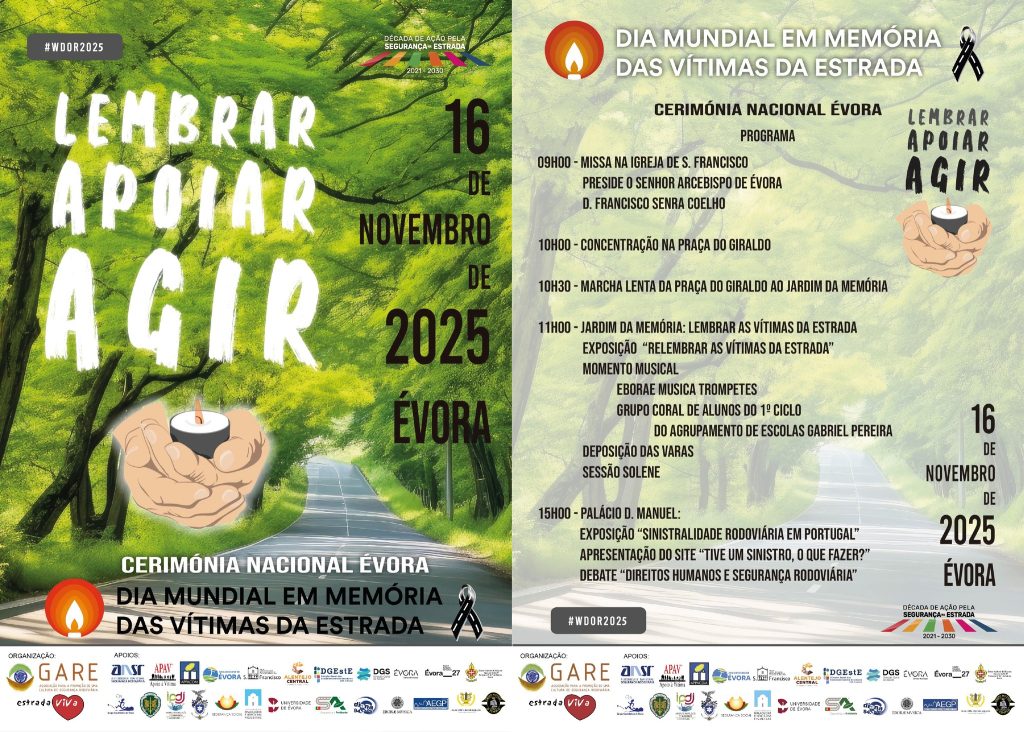 Évora acolhe amanhã, dia 15, a 𝗖𝗲𝗿𝗶𝗺𝗼́𝗻𝗶𝗮 𝗡𝗮𝗰𝗶𝗼𝗻𝗮𝗹 𝗱𝗼 𝗗𝗶𝗮 𝗠𝘂𝗻𝗱𝗶𝗮𝗹 𝗲𝗺 𝗠𝗲𝗺𝗼́𝗿𝗶𝗮 𝗱𝗮𝘀 𝗩𝗶́𝘁𝗶𝗺𝗮𝘀 𝗱𝗮 𝗘𝘀𝘁𝗿𝗮𝗱𝗮, uma data que convida à reflexão, à homenagem e à ação em prol da segurança rodoviária.