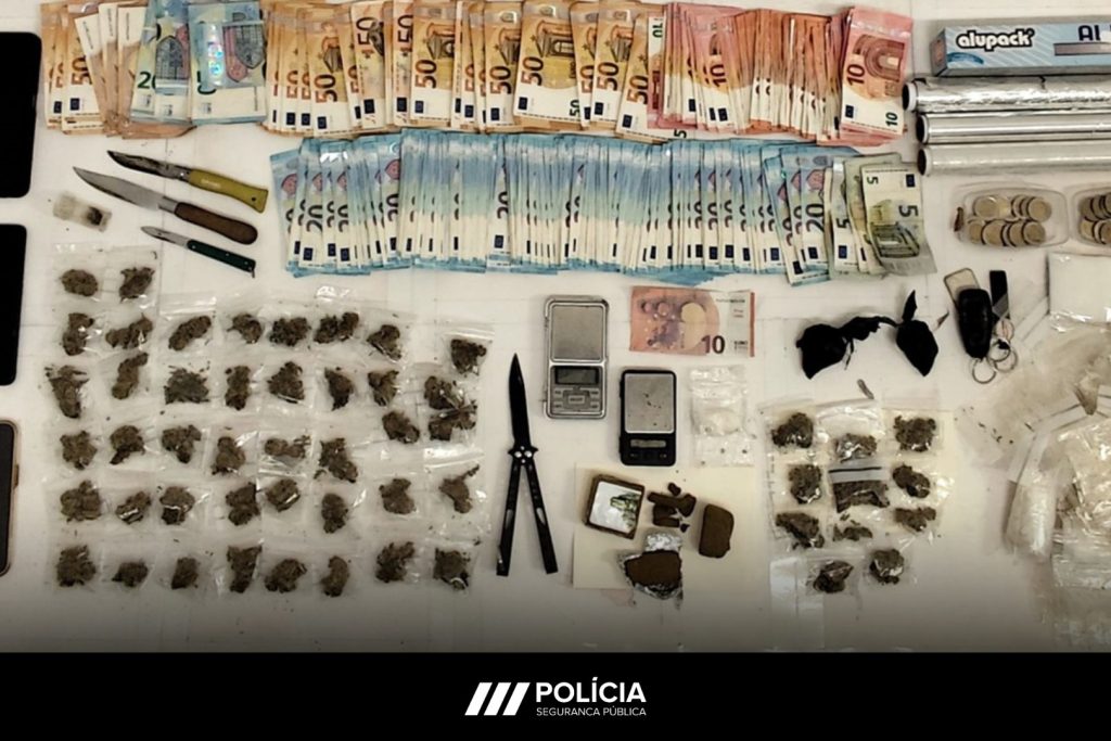 De acordo com a PSP, foram apreendidas “180,38 doses individuais de haxixe; 26,14 doses individuais de liamba; cinco sementes de cannabis; 6.767 euros em numerário; um automóvel; uma arma branca da Classe A (faca borboleta); duas balanças de precisão; três telemóveis; e outros itens relacionados com o tráfico de estupefacientes”.