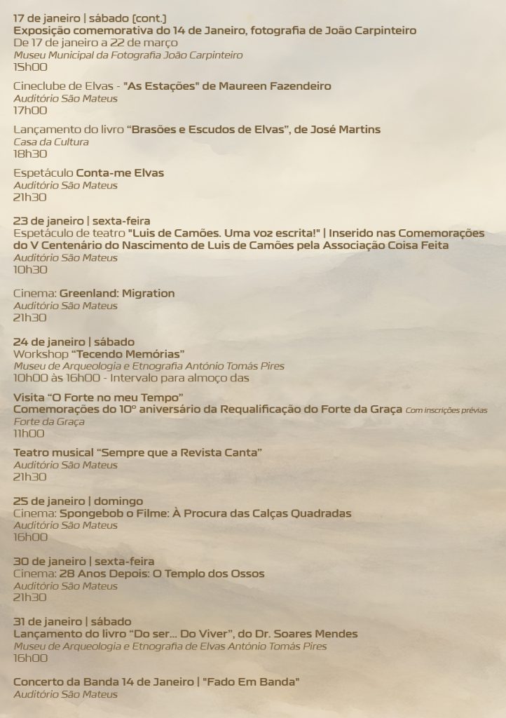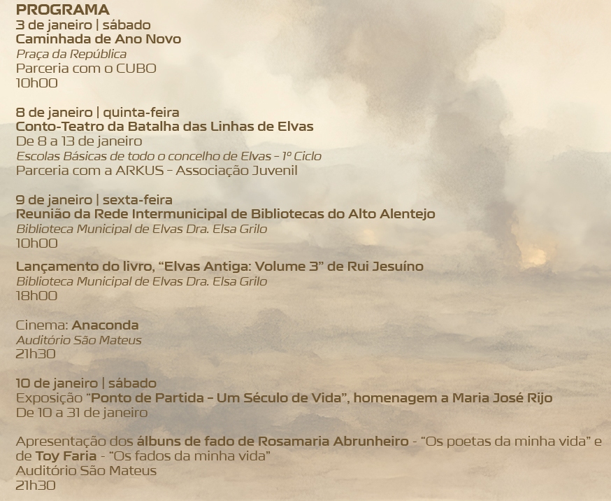 A progrmação, que se inicia já este sábado, dia 3, e que se estende até 31 de janeiro, com todo o tipo de atividades – desportivas, culturais e recreativas – é acompanhado de uma mensagem do presidente da Câmara Municipal de Elvas, Rondão Almeida, que reproduzimos na íntegra: