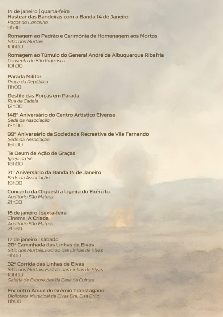 A Câmara Municipal de Elvas divulgou esta sexta-feira, 2 de janeiro, o programa completo das comemorações do 367º aniversário da Batalha das Linhas de Elvas, que se celebra no próximo dia 14 de janeiro, com as habituais cerimónias militares.