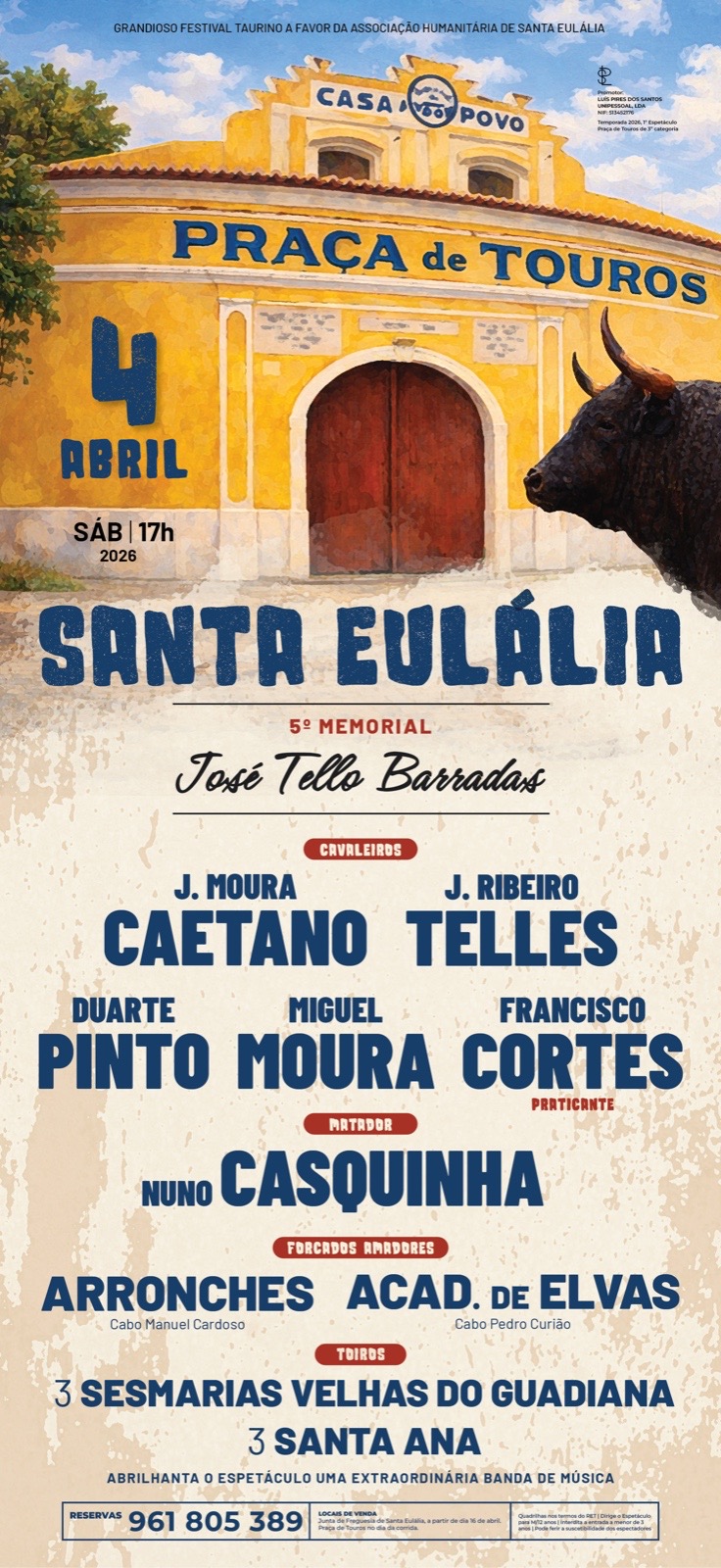 A Praça de Touros da Casa do Povo de Santa Eulália recebe, no próximo dia 4 de abril de 2026, pelas 17 horas, um Festival Taurino a favor da Associação Humanitária de Santa Eulália, integrado no 5.º Memorial José Tello Barradas.