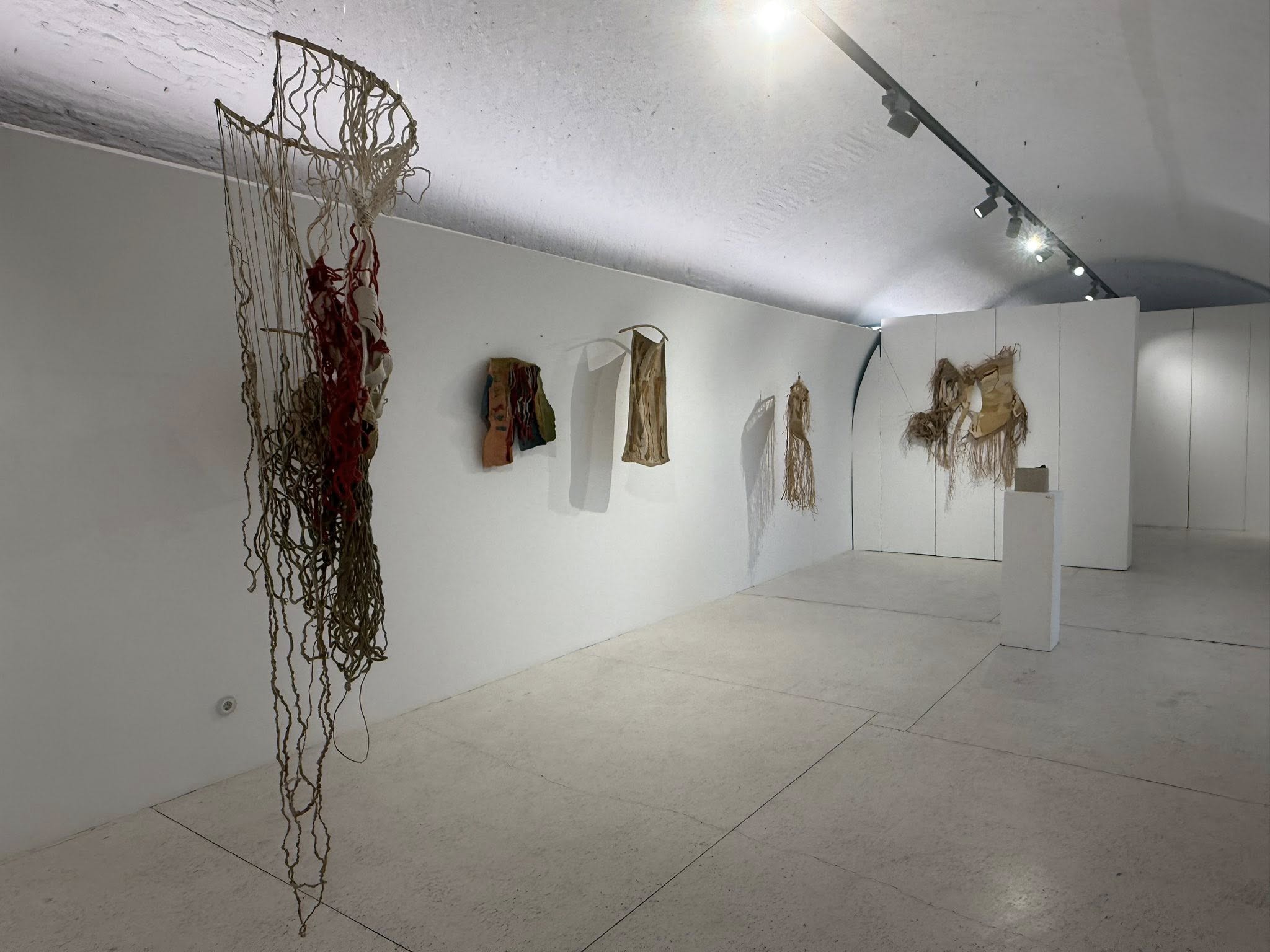 Através de fibras, nós e estruturas entrelaçadas, a artista propõe uma reflexão sobre a resiliência dos materiais e das práticas artesanais, valorizando processos manuais e a expressividade das texturas.