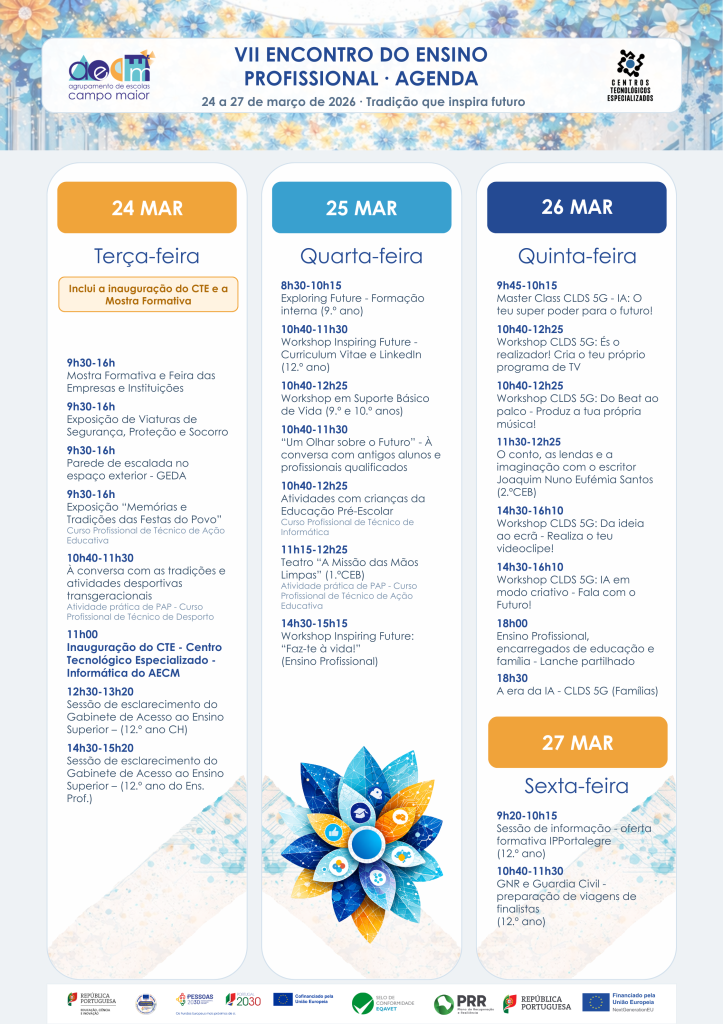 O Agrupamento de Escolas de Campo Maior promove, entre os dias 24 e 27 de março, o VII Encontro do Ensino Profissional, sob o lema “Tradição que inspira futuro” e com um vasto leque de atividades na Escola Secundária da vila.