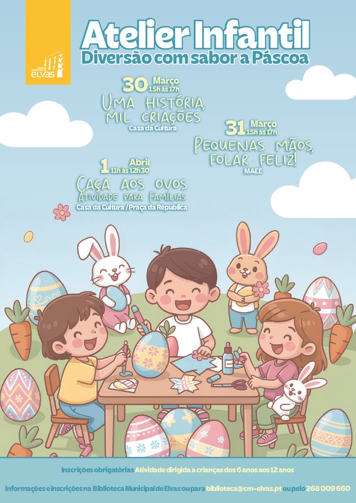 A Câmara Municipal de Elvas promove o Atelier Infantil “Diversão com sabor a Páscoa”, com várias atividades criativas dirigidas a crianças dos seis aos 12 anos, a decorrer entre os dias 30 de março e 1 de abril, em diferentes espaços culturais da cidade.
