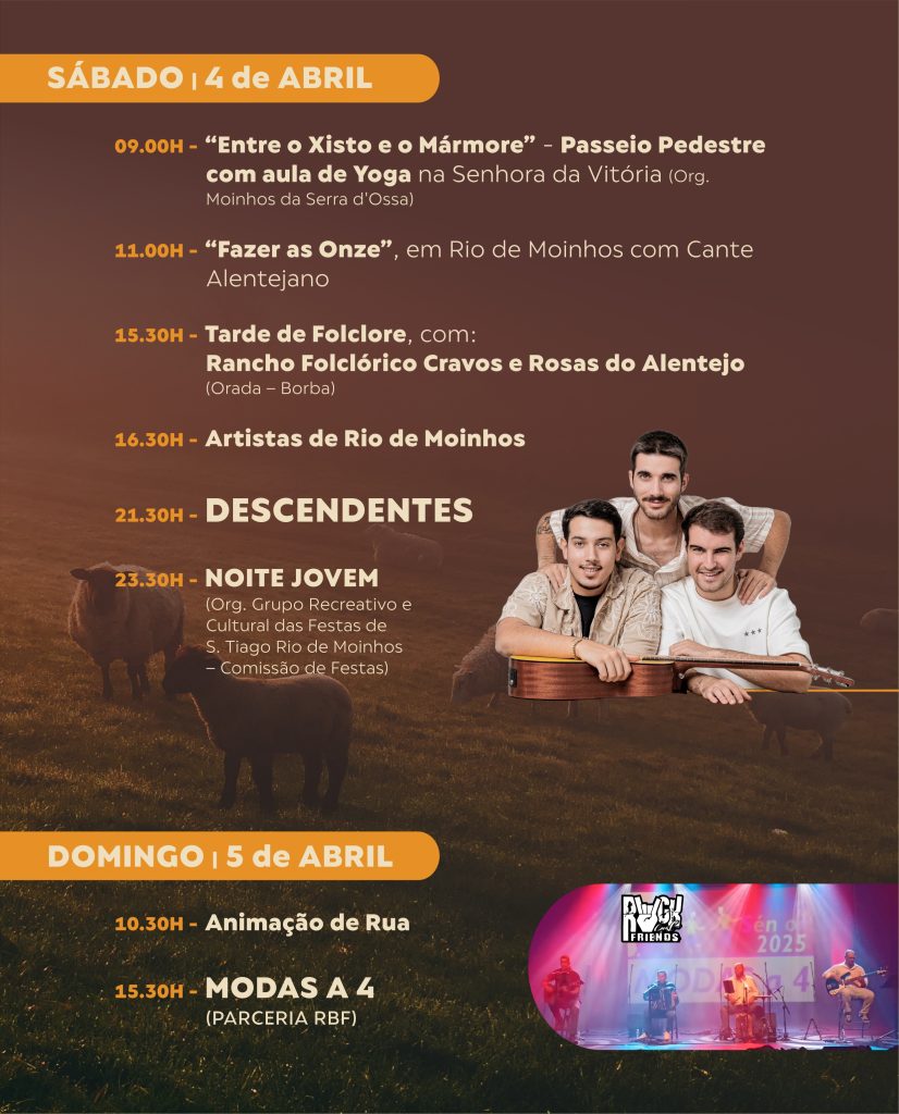 Do programa, a organização desta os espetáculos com “Corda Bamba”, com a borbense Diana Velhinho (3 de abril), “Descendentes” (4 de abril) e “Modas a 4” (no encerramento da feira, a 5 de abril, em parceria com a RBF – Associação Rock Best Friends).