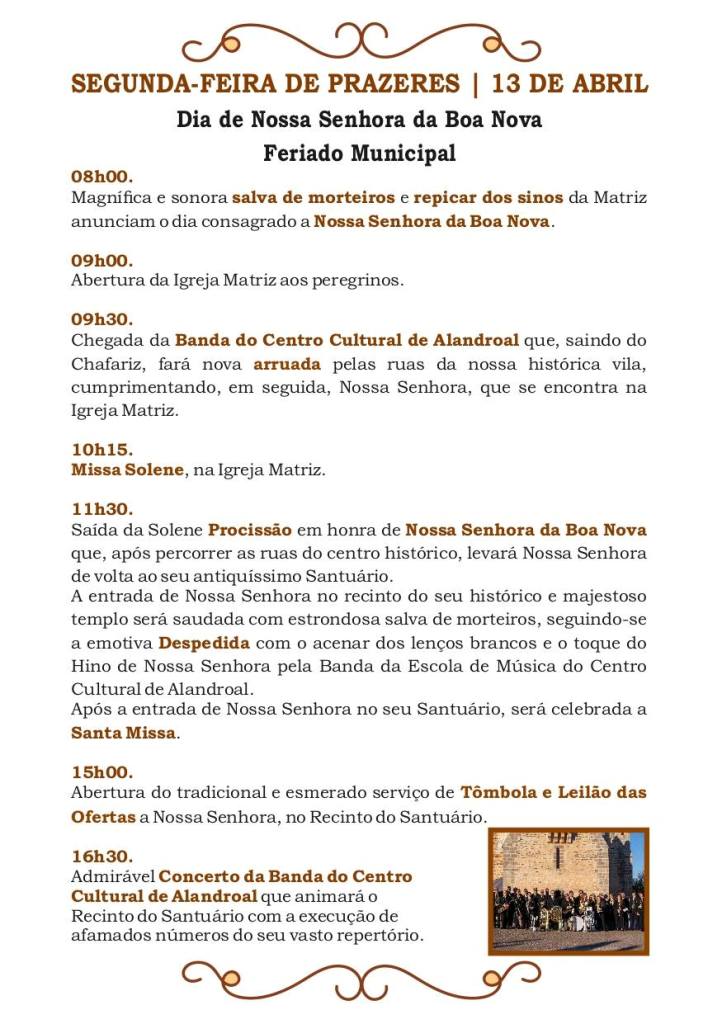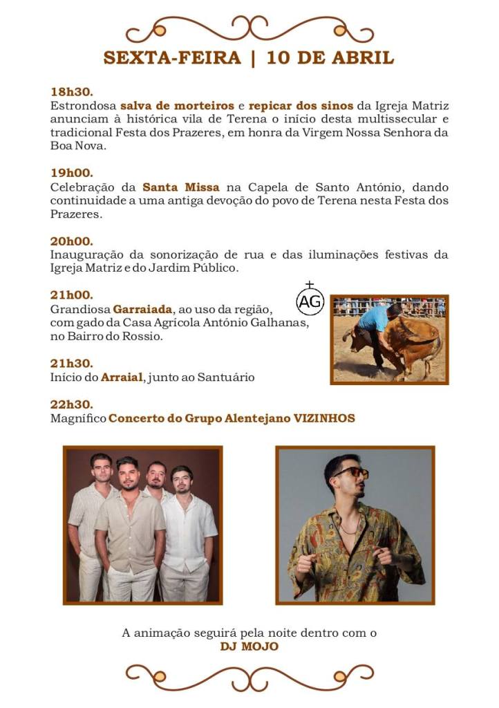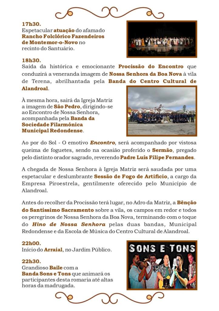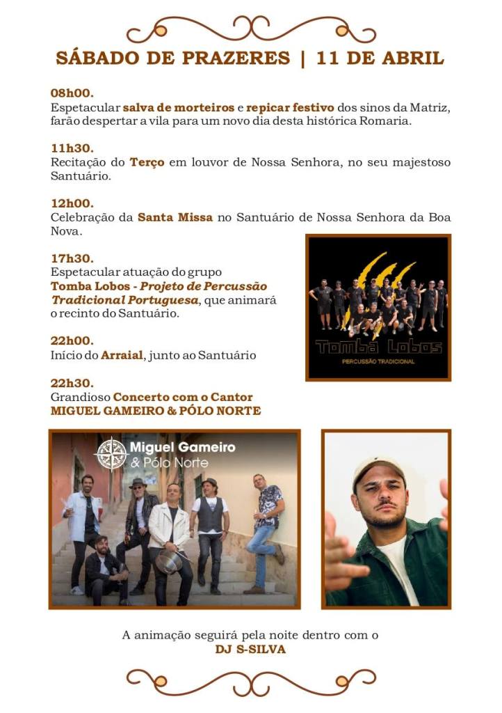 “Os dias mais consagrados à Senhora da Boa Nova serão o domingo e a segunda-feira, que é o feriado municipal do concelho de Alandroal. Já no dia da abertura, sexta-feira, temos o grande concerto dos Vizinhos, uma banda muito conhecida na atualidade, e no sábado temos o Miguel Gameiro com os Pólo Norte”, refere desde logo o juiz da Confraria, Nuno Pereira.