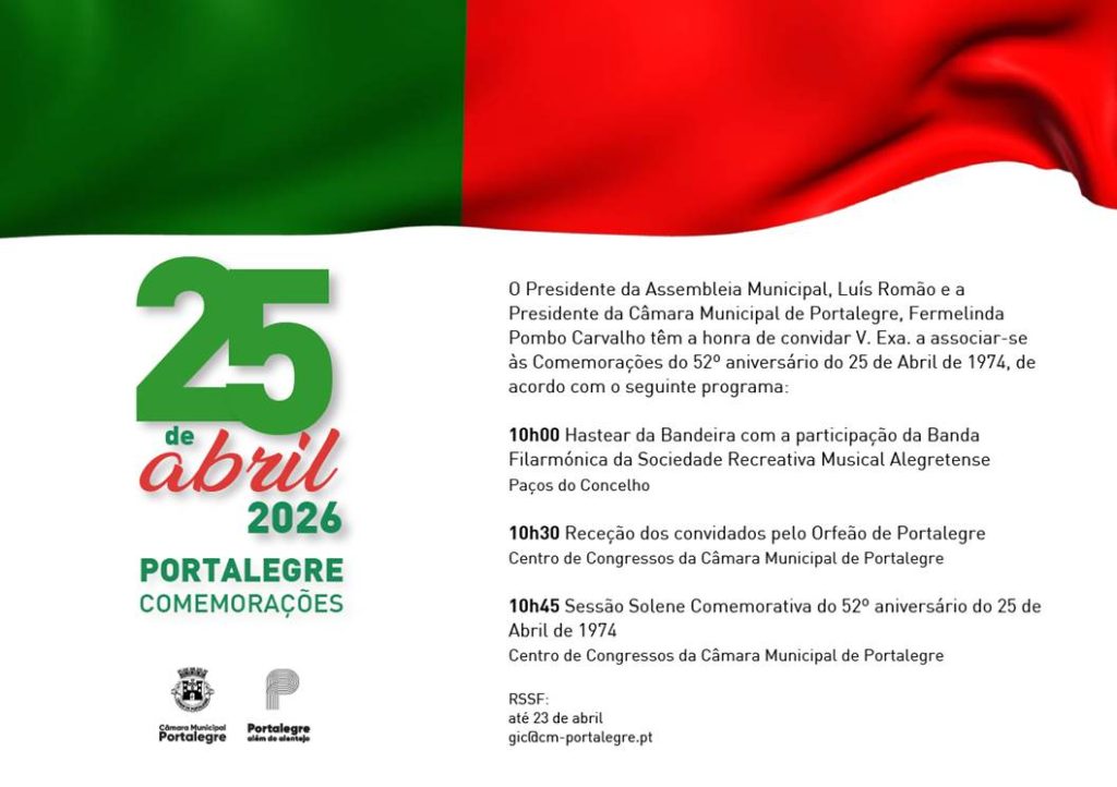 Às 10.30 horas ocorre a receção aos convidados pelo Orfeão de Portalegre, no Centro de Congressos da Câmara Municipal, seguindo-se a Sessão Solene Comemorativa do 52.º aniversário do 25 de Abril de 1974, a realizar no Centro de Congressos, às 10.45 horas.